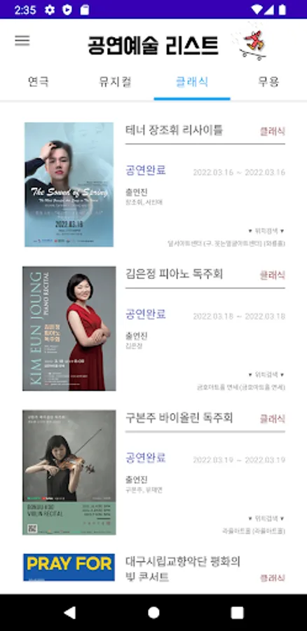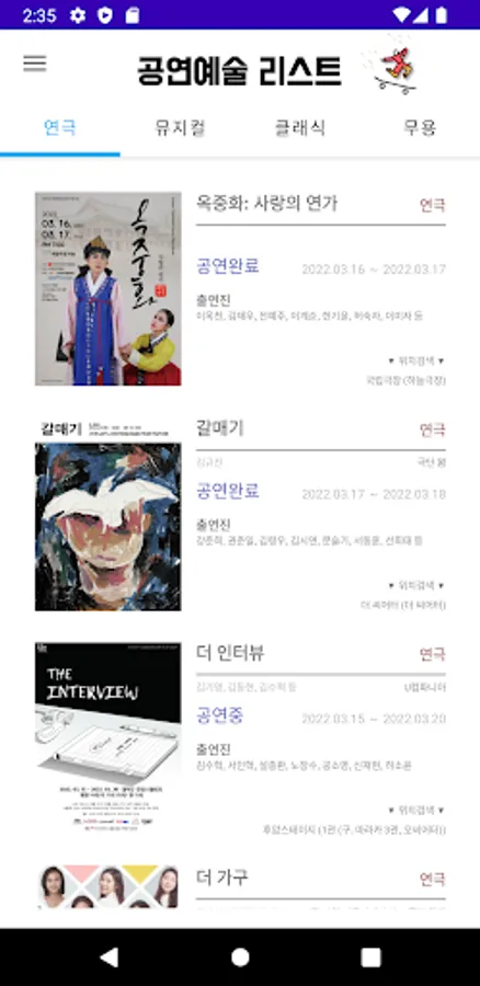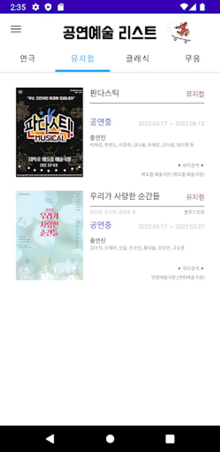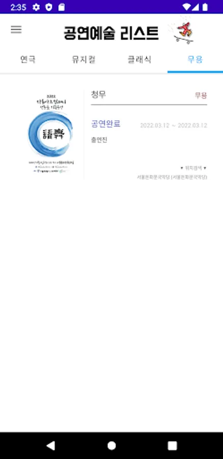 This is an app that displays performance information such as plays, musicals, classical music (Korean traditional music, orchestra, etc.), dance including start/end dates within the last 6 months from today.