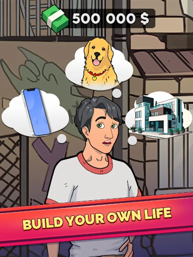 Move from streets to dorms. Then move to a small, but cozy apartment. In the future you will decide between a townhouse, villa or even a private island. Live the second life in luxury simulator!