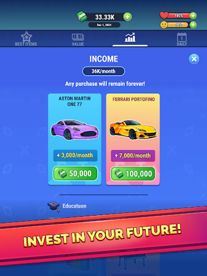 - Enjoy easy gameplay of tycoon life - make choices and tap the screen.