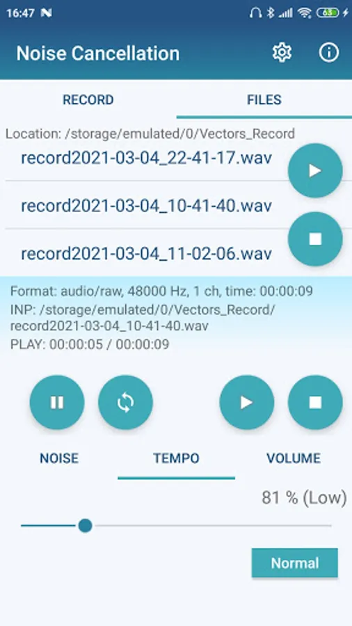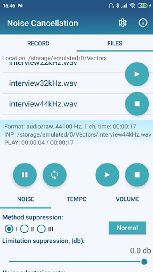 The App allows to record an audio files from microphone, to play their depending from the dynamic changing of NC filter settings and to change speech tempo setting with time stretching (GritTec Time Stretching engine).