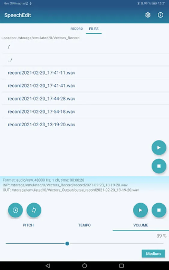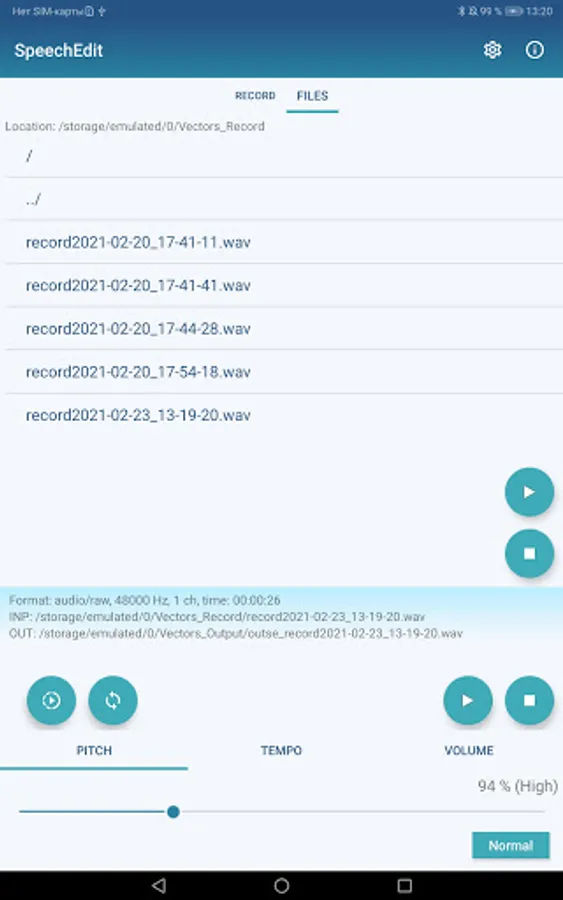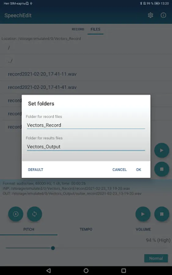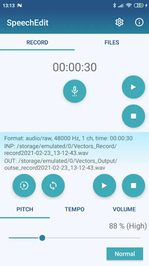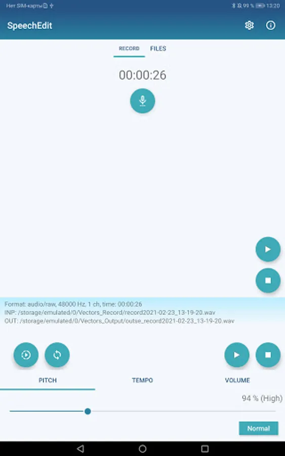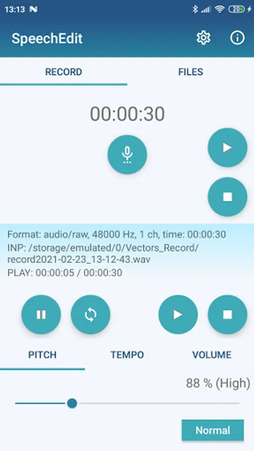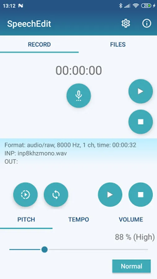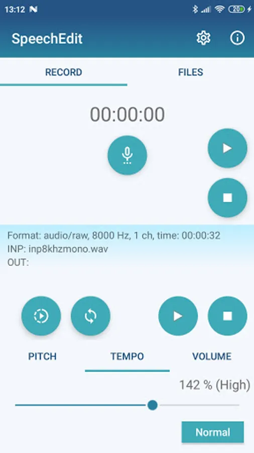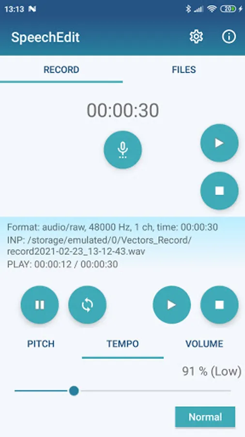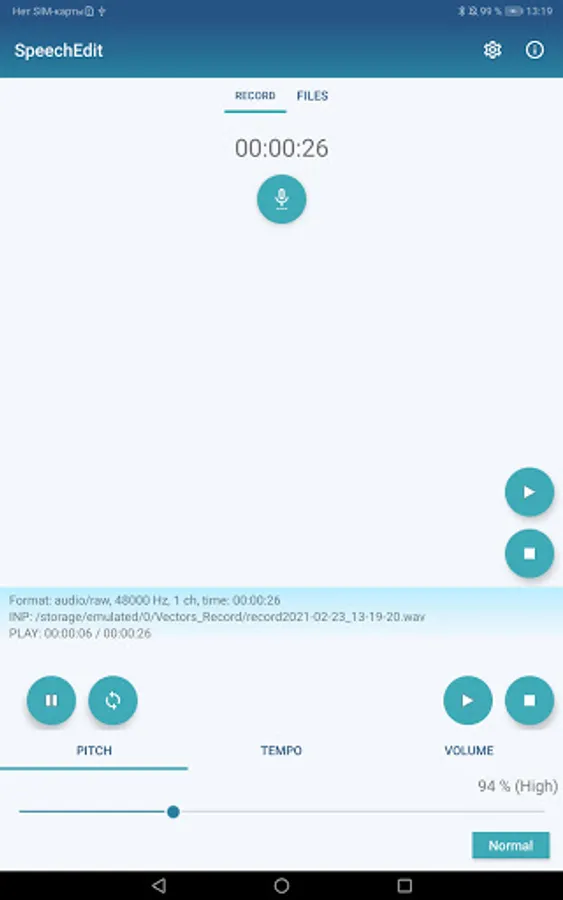 SpeechEdit is used for changing of pitch and tempo in speech and audio records. The App allows to record an audio files from microphone, to play their depending from the dynamic changing of speech tempo with time stretching and to change pitch settings.