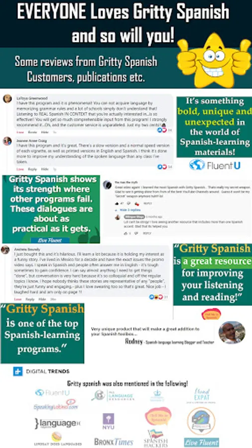 Looking to learn Spanish and improve your listening & reading comprehension? Gritty Spanish will put you in a real Spanish-speaking world and expose you to how Spanish is Spoken in real life. It's all about listening to engaging dialogues and reading exactly what's said in Spanish/English side by side to help you dramatically improve your listening and reading comprehension!