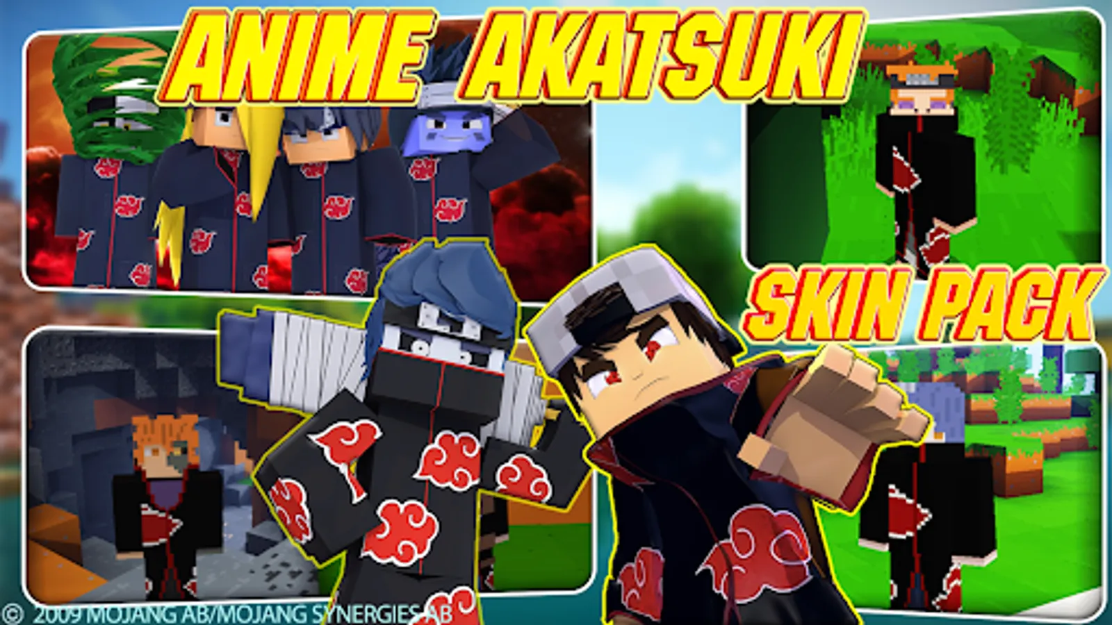 In this app you can also get the akatsuki ninjas Skin Pack for mcpe. You can use it on your preference Servers, Worlds or Realms. This pack is created for fans of the Anime Naruto, you can use it with your friends, and select on Teams, like the Anime. You can choose and download any skin you like. This collection of skins was created to decorate and color the classic mainkarft game.