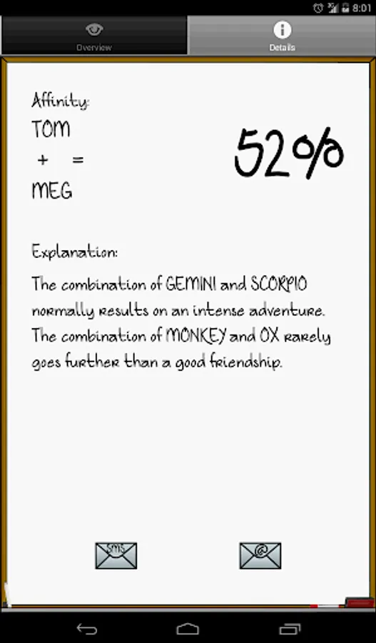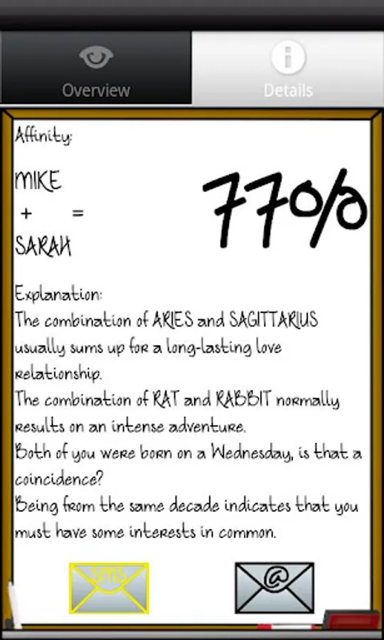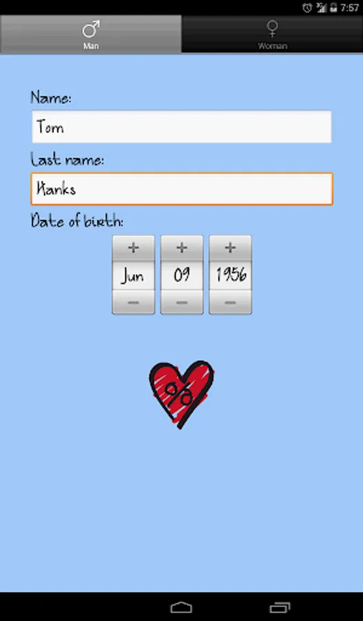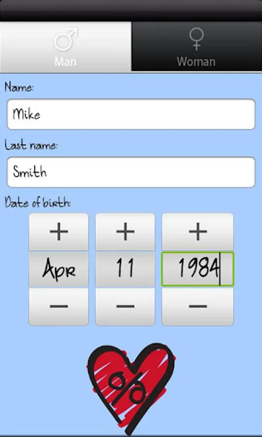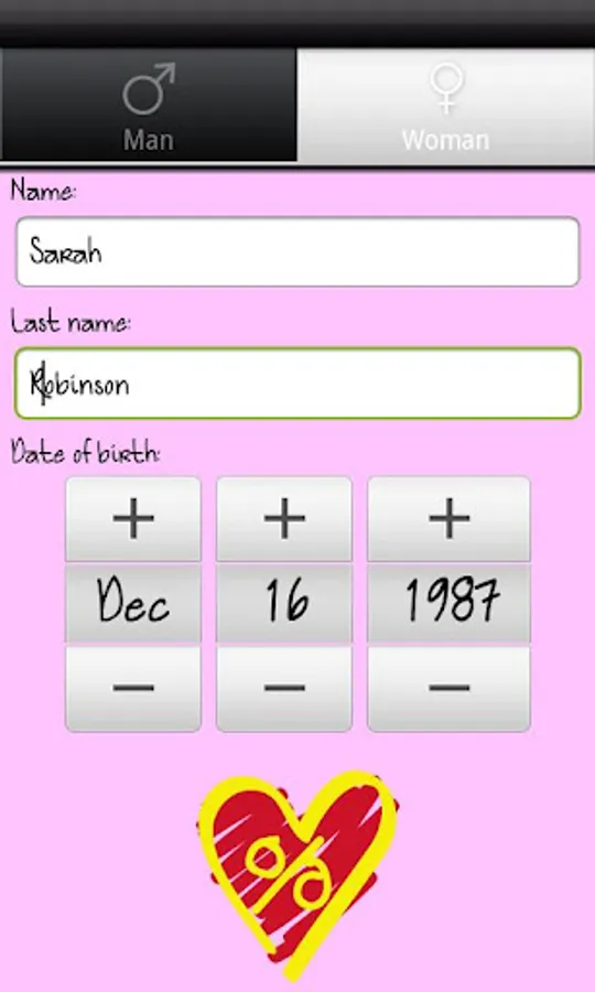 Enter your name, last name and date of birth of you and your partner and get your love percentage and a justification for it. Share it with everybody by sending an email or sms with the results!