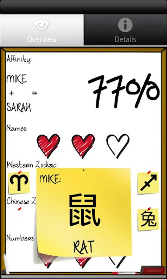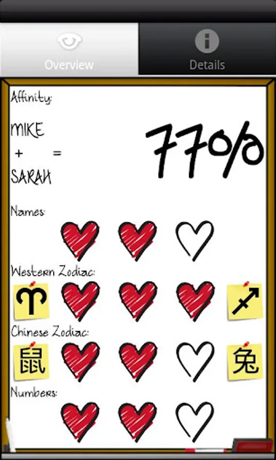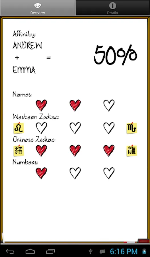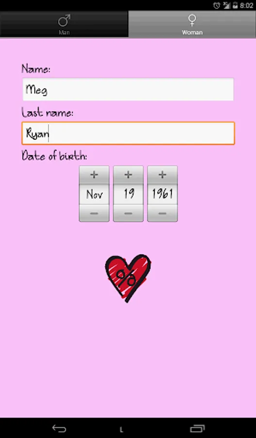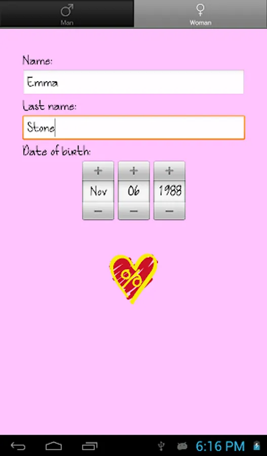Do you want to know how compatible are you with that special person? Love Percent (Love%) computes the affinity between two people, based on astrological and numerical theories.
