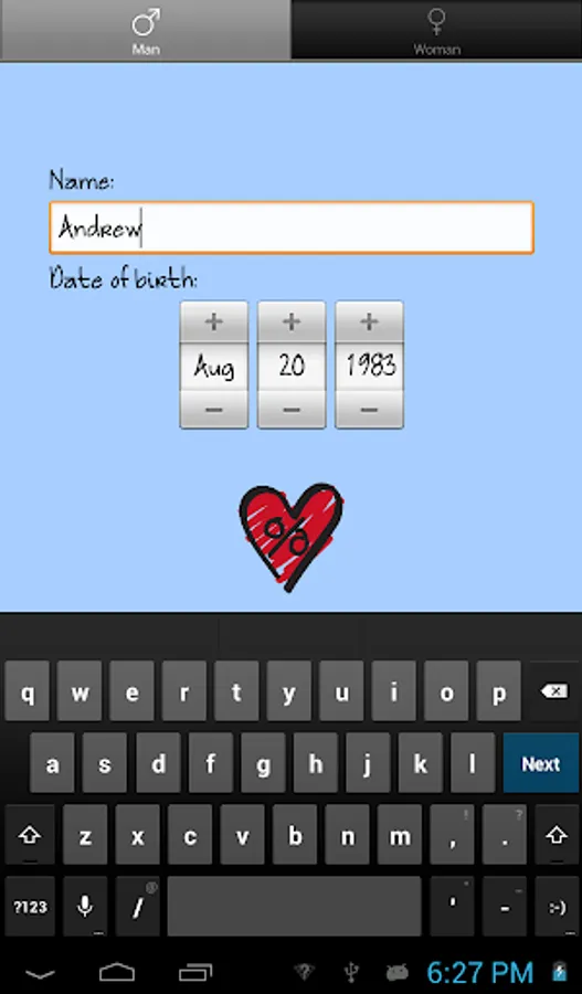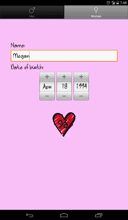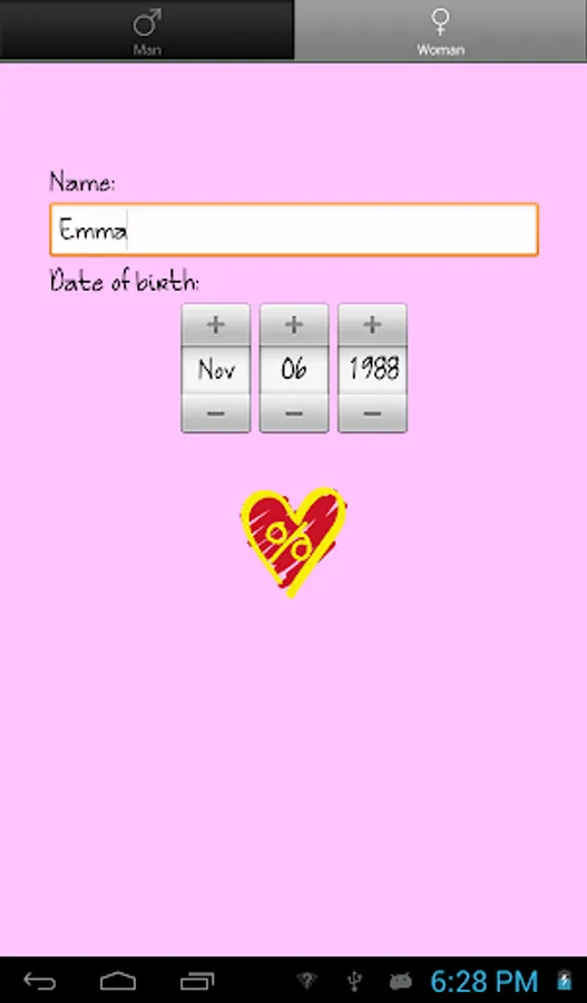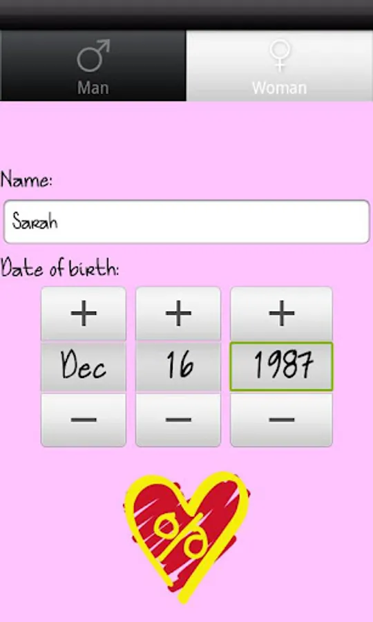 Enter your name and date of birth of you and your partner and get your love percentage and a justification for it.