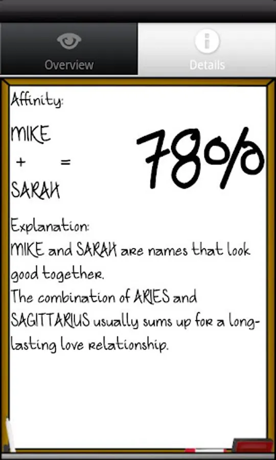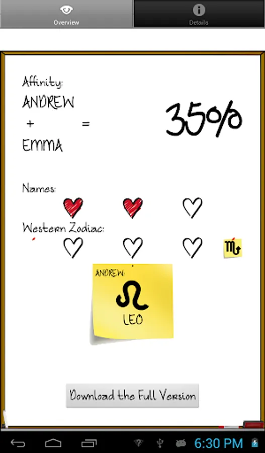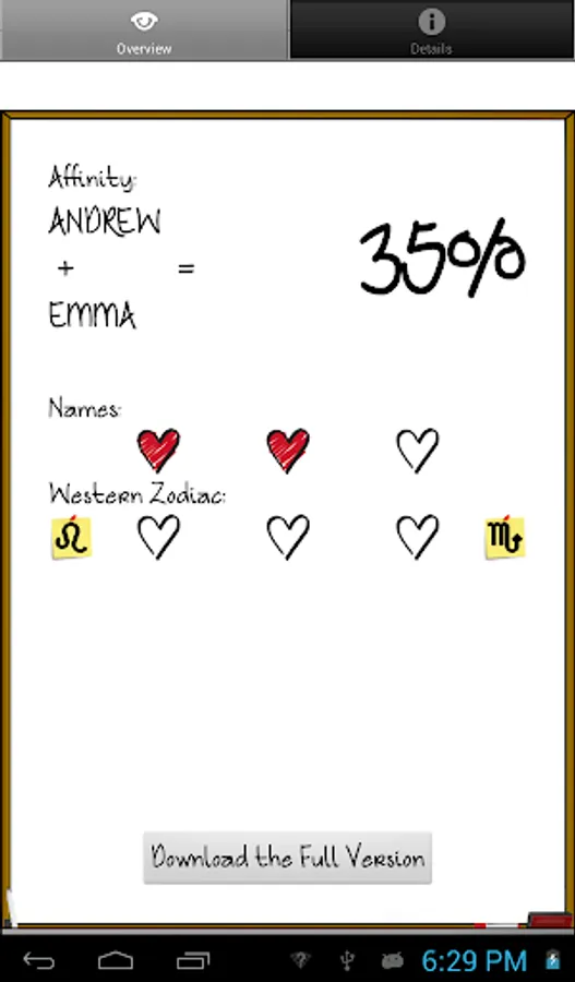 For a better experience, download the full version of Love %, also on Google Play. This version uses your Chinese zodiac for computations, enables you to send the results by SMS or email, and has no ads (ad free).
