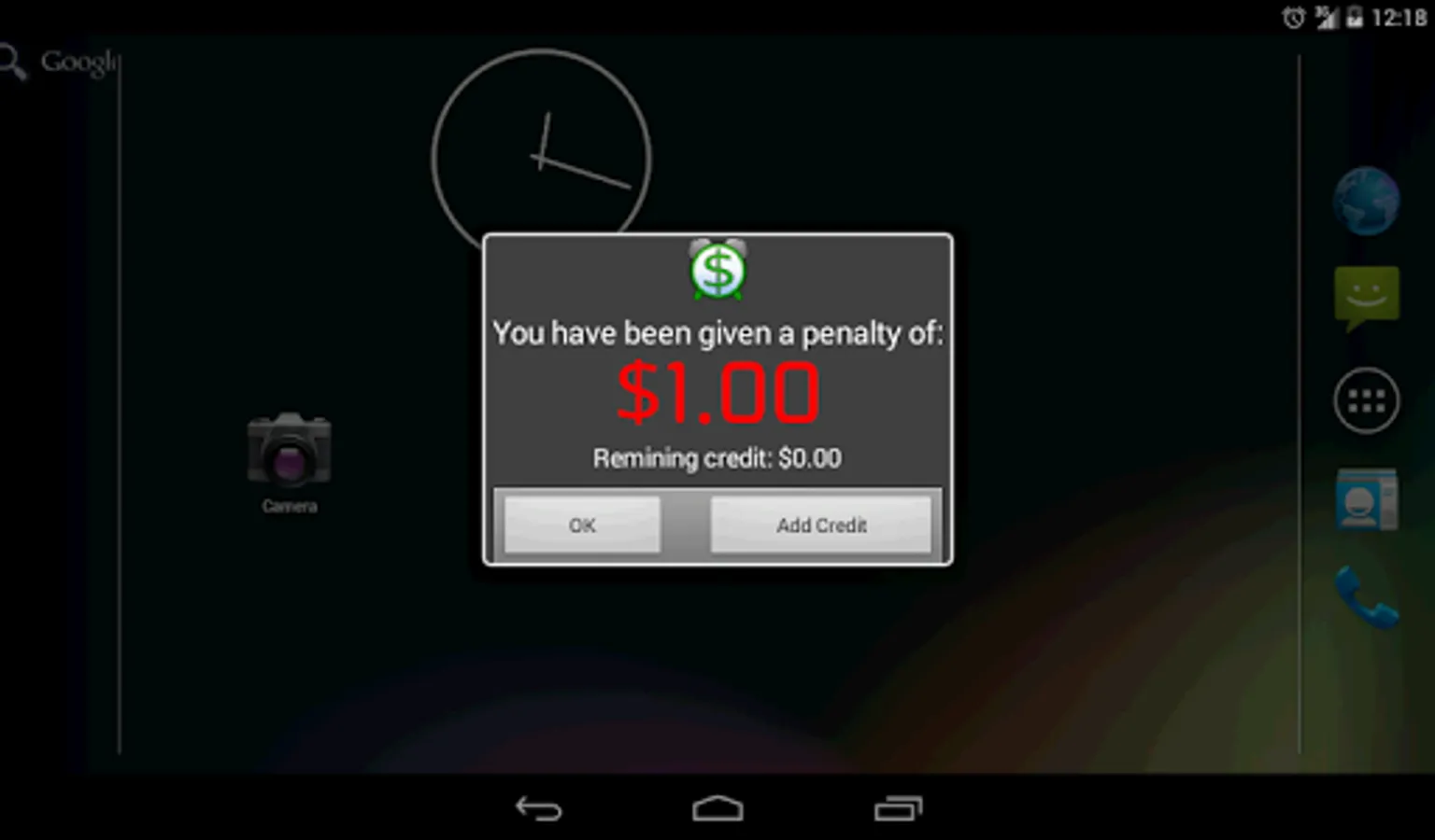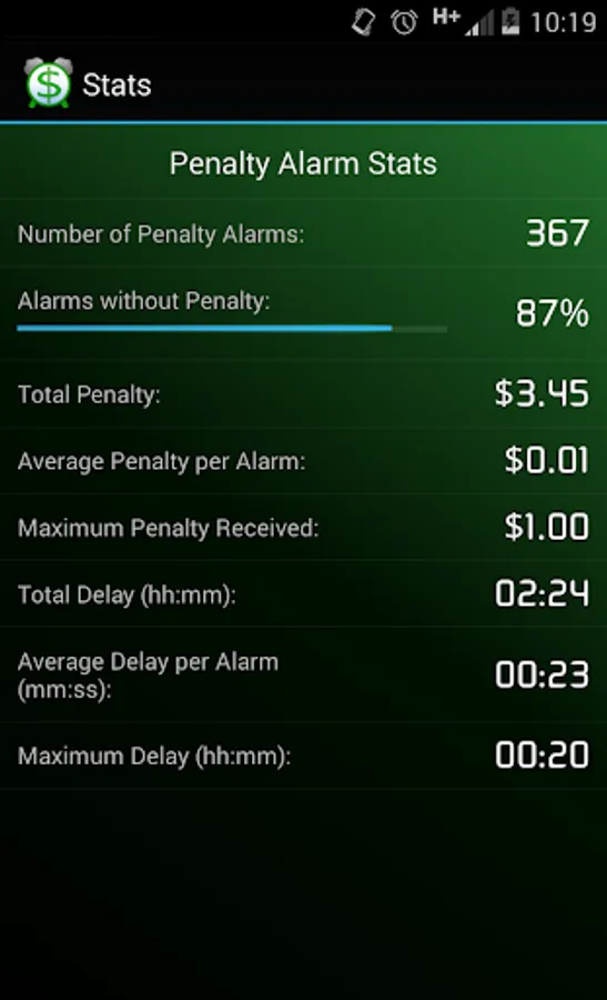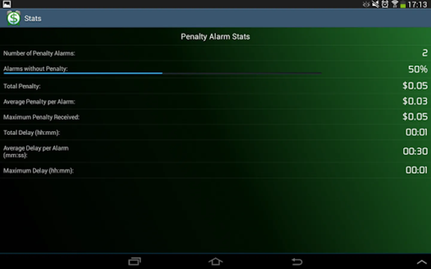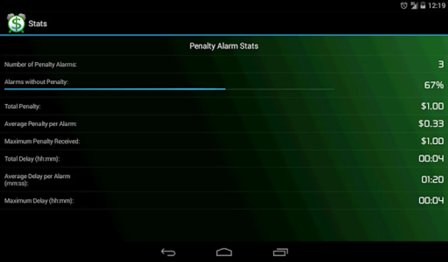 - Penalty Alarms: You can optionally set up the alarms to charge you a cash penalty if you wake up late. You decide the amount per minute and the maximum per alarm.