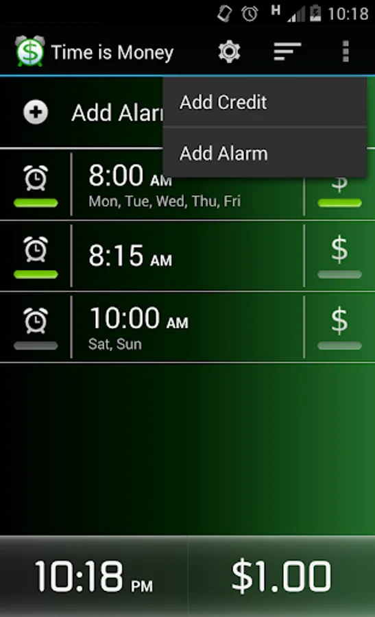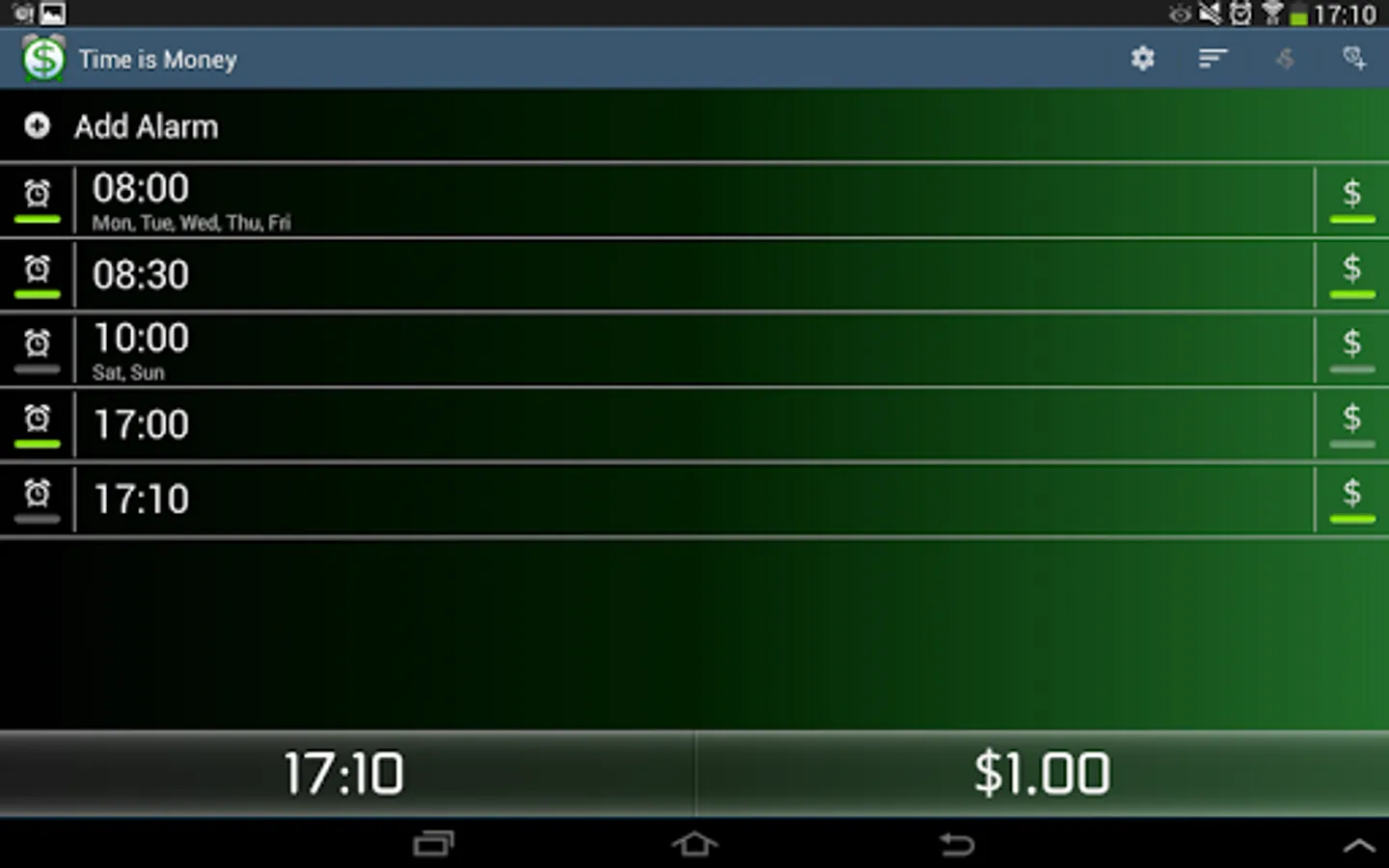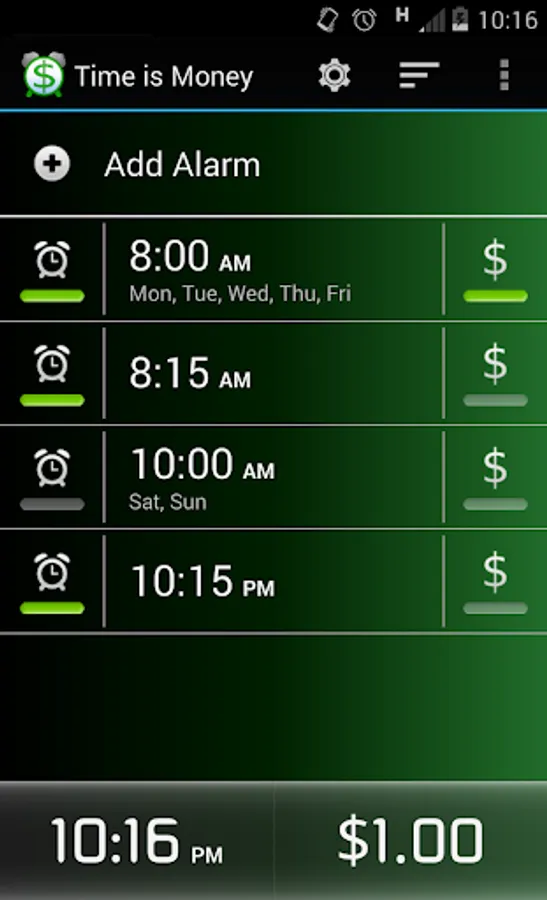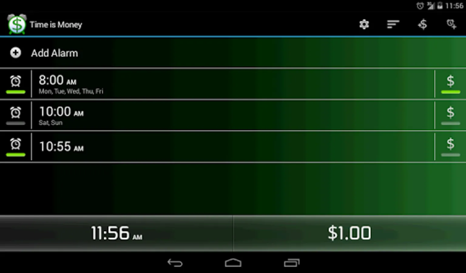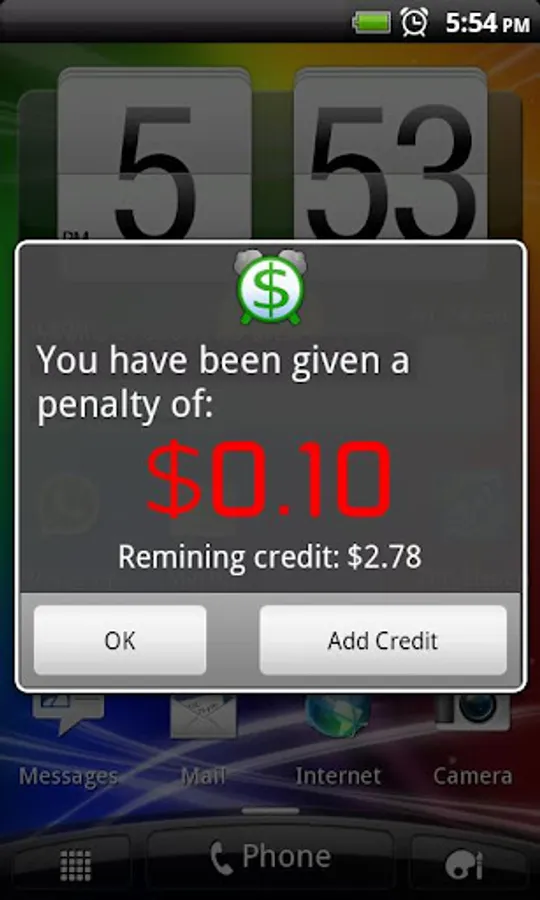 - Penalty Alarms: You can optionally set up the alarms to charge you a cash penalty if you wake up late. You decide the amount per minute and the maximum per alarm.