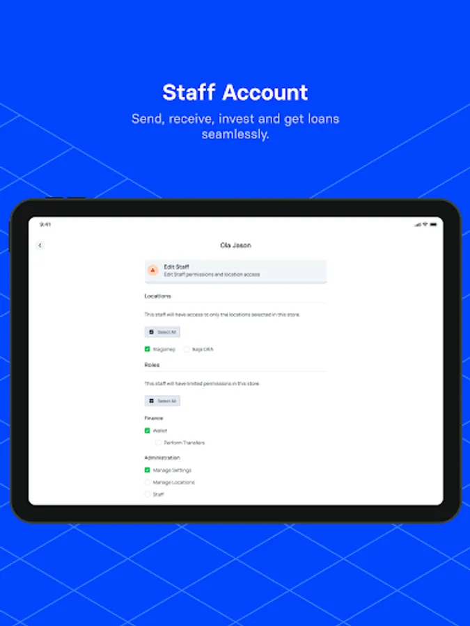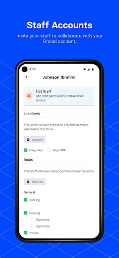 Invite your staff to collaborate with your Grocel accounts. Different staff may have different role and permissions as set by the business owner. All staff will have unique phone number and password.