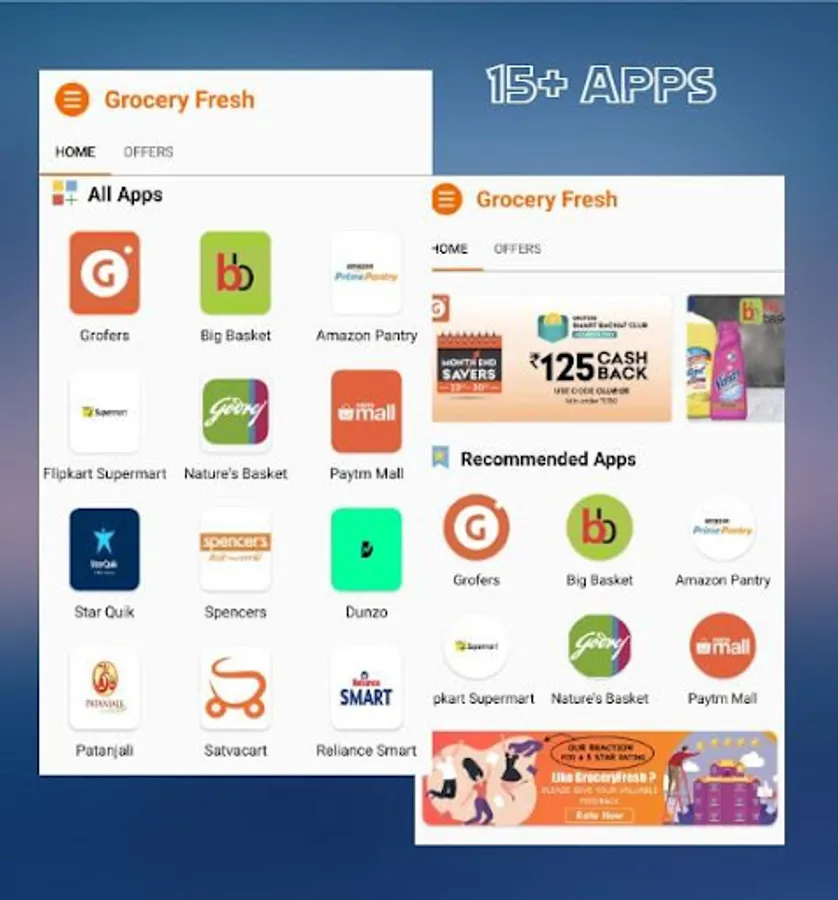The Grocery Fresh app ( grocery store online ) is a Combination of all Online grocery shopping apps, Online milk delivery and Online grocery supplier with great offers through different apps like Jiomart, Grofers, Big basket, D mart, Reliance fresh, Milk basket, big bazaar, Nature’s basket, Dunzo, Spencers, Patanjali store etc in one app. You can compare price on other Online grocery and your nearby Grocery Store and can get delivered on your doorstep. You don't need to step outside for Grocery items.