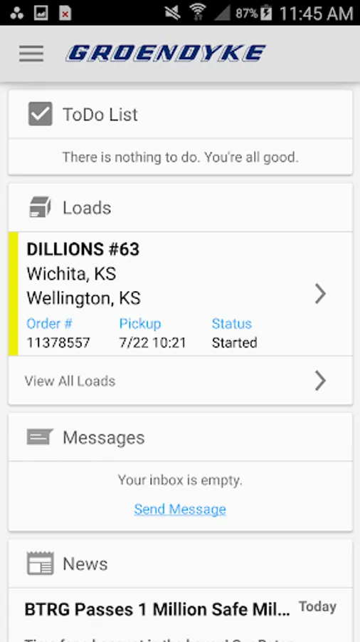 Groendyke Transport Mobile gives employees access to important company information no matter where they may be. With this app, our professional drivers can access their load information from anywhere, and they can scan important load, safety and Talent Office documents right from their smartphones for convenient transmission back to the terminal.