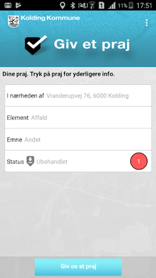 Here you have the opportunity to inform us of problems in the municipality of Kolding streets, trails or parks. We are happy to specific inquiries from you. Good luck and thanks for your hint.