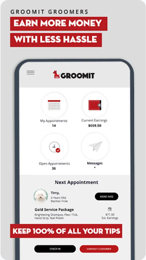 Join Groomit, the nations first in home pet grooming service. Apply on our website & once you’re approved, dog owners will send grooming requests your way. Do it full or part time, create your own schedule & you’ll get paid automatically into your bank account. Build your own customer business with Groomit. We provide you with grooming requests near you, supplies, insurance & team support. Don’t worry about anything.