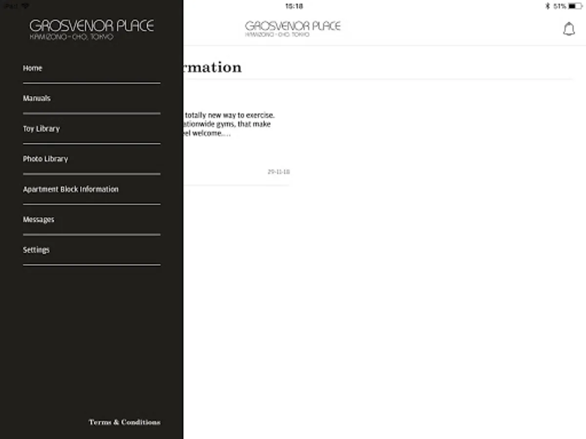 A Grosvenor Luxury Residential apartments app for residents of Grosvenor Place Kamizonocho. From accessing electronic manuals to contacting your concierge, this application offers a variety of features. When using this application for the first time, you will require an internet connection and your apartment details so that the data is downloaded and stored for offline access.