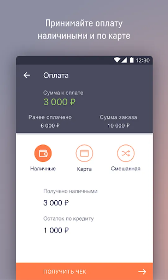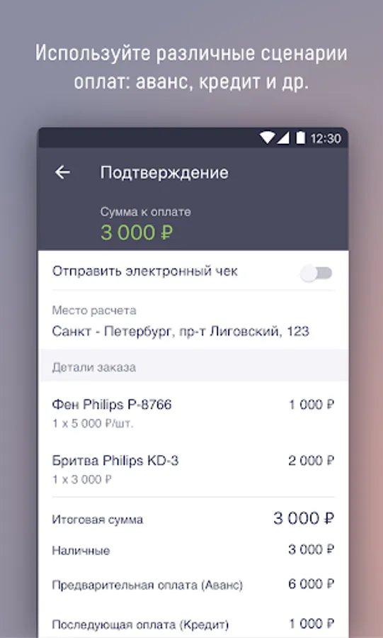 Supports work on FFD 1.05. Allows you to implement various payment scenarios: advance payments, prepayments and much more.