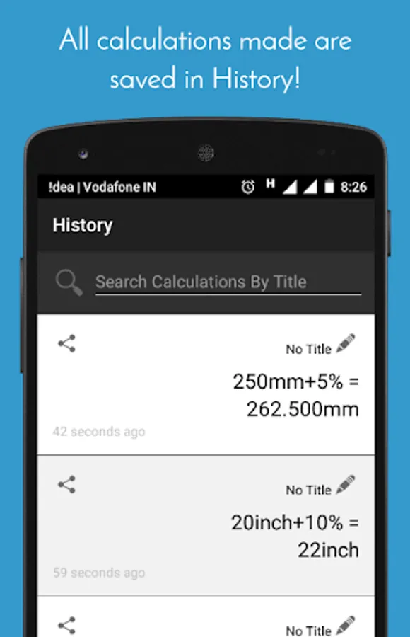 Besides being a unit converter, it is also a full-fledged calculator which allows you to perform calculations effortlessly with or without your units. All calculations are saved in history and can be organized with titles and searched through.