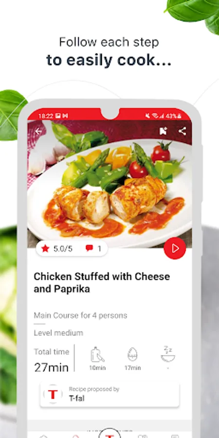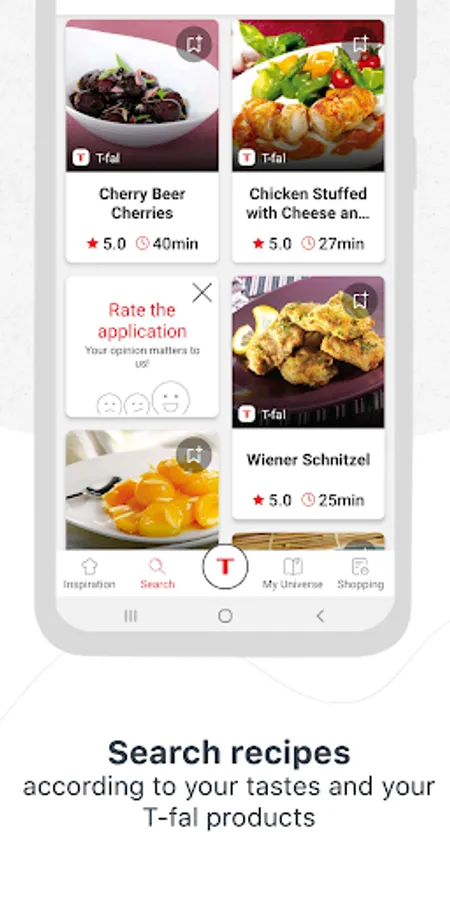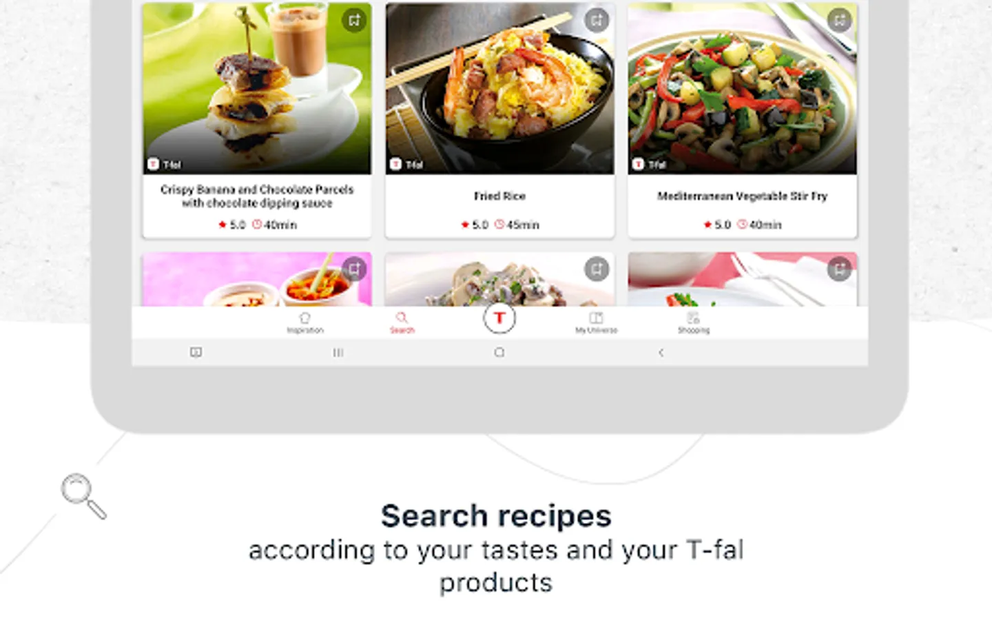 The T-fal app is your real kitchen companion that accompanies you every day. The ""step-by-step"" recipes help you make your favorite starters, main courses and desserts according to your preferences, the ingredients available and the number of portions you want. For each recipe you will find a detailed description of the ingredients and the cooking time for each.