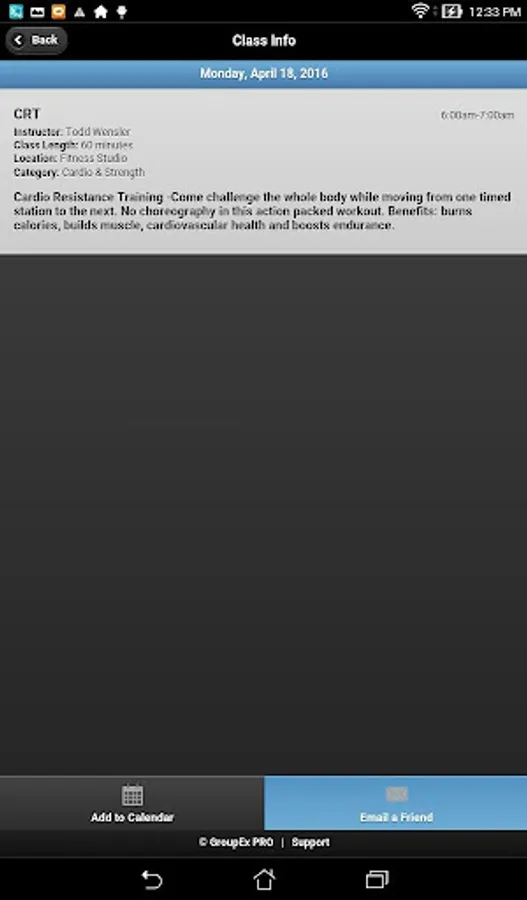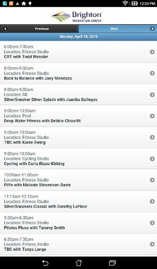 Group fitness schedule for Brighton Recreation Center. Includes up-to-date classes and sub information. Also features Add to Calendar and Email a Friend functions.