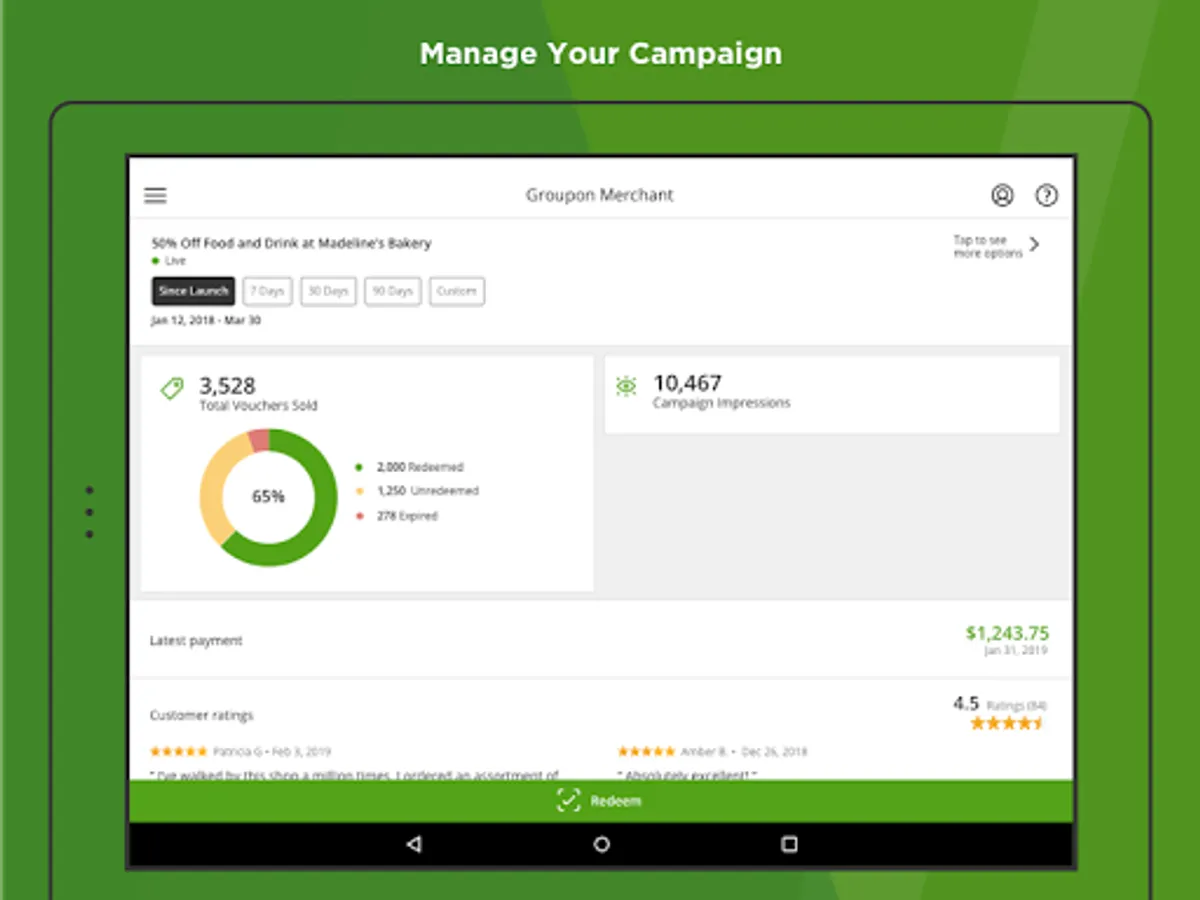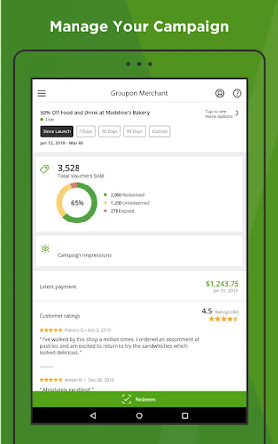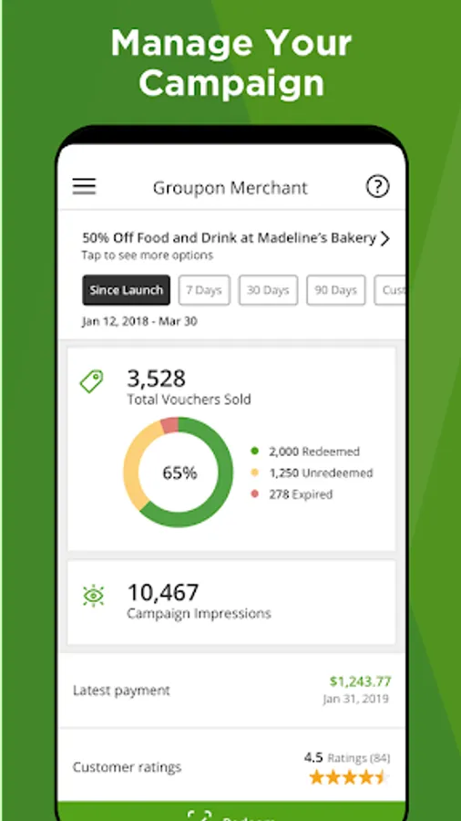 The new GrouponMerchant app lets merchants manage their Groupon campaign directly from their smartphone. Use the GrouponMerchant app to: