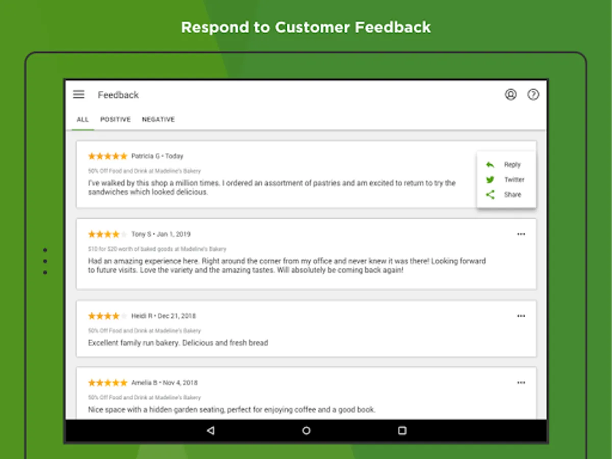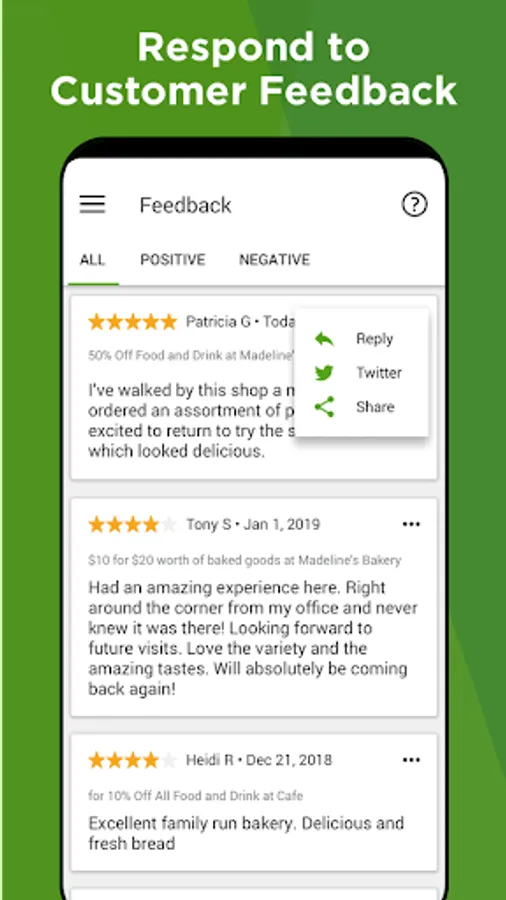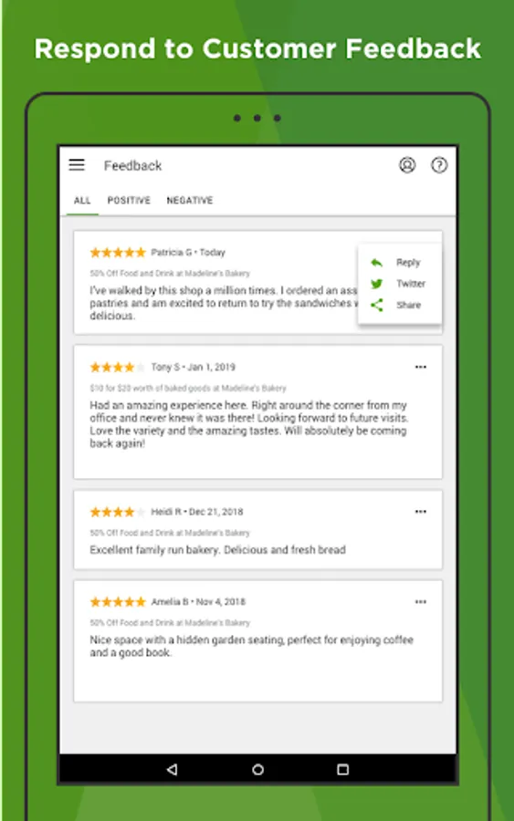 View customer feedback and share rave reviews on your social media pages