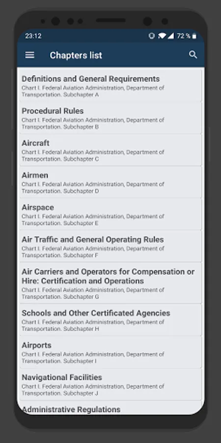 This app contains a collection of Federal Aviation Regulations and Aeronautical Information Manual with nice interface and simple navigation. Text search in all parts of the app will allow you to easily find the desired section of the desired chapter.