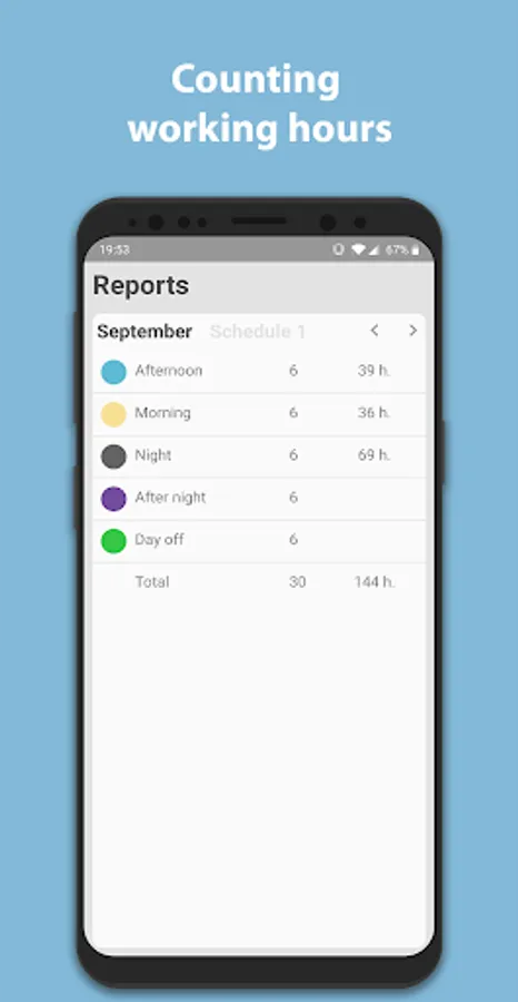 For each shift, you can set your own working hours. You can view the calculated working hours for the selected month in the "Reports" section.