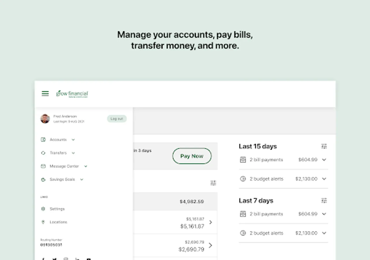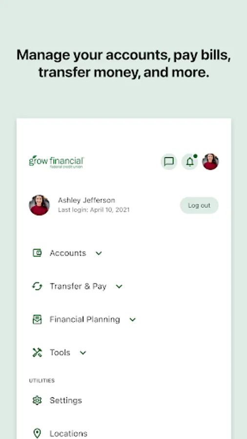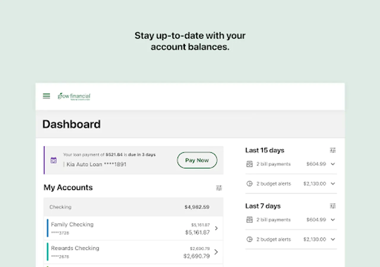 Additional data charges may apply. Please see your wireless carrier for more information. You can also log in to Grow online banking at growfinancial.org.