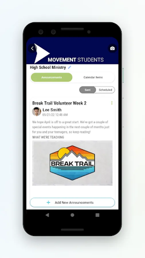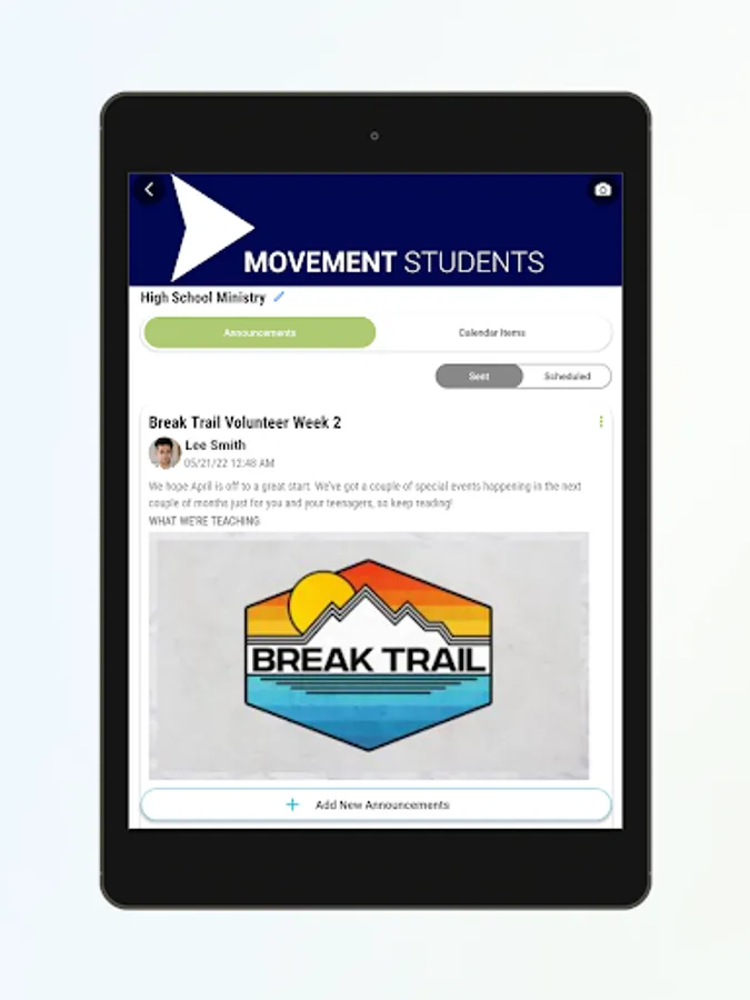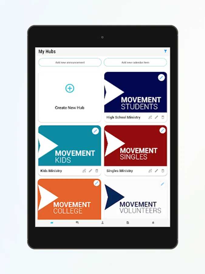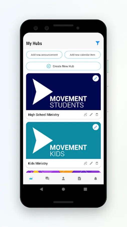 Hubs is a new tool to make you the communication master your ministry teams have always wished for! Use Hubs for your volunteer teams, parent communication, ministry leadership, and whatever you can imagine. Hubs combines calendar events, announcements, and private messaging all in one location, and the app makes it easy for anyone to access from their phone. Allow your ministry team to communicate all in one place without the need to join a social media platform.