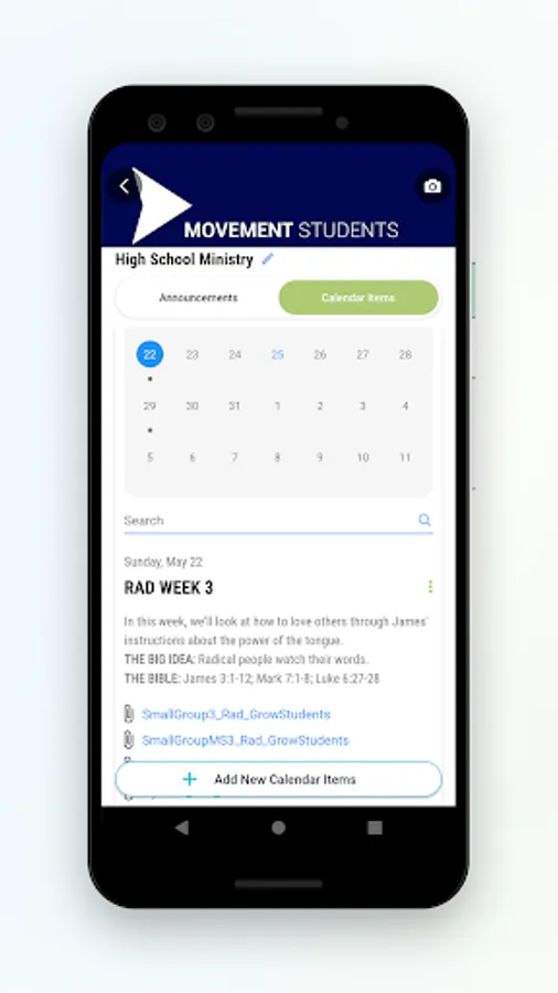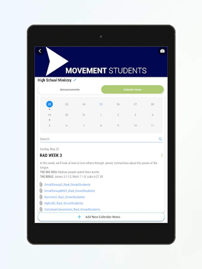 CALENDAR ITEMS: This calendar allows you to schedule regularly scheduled or one-time events for everyone to see from the ease of their phone. Post event details and any files needed for the event.