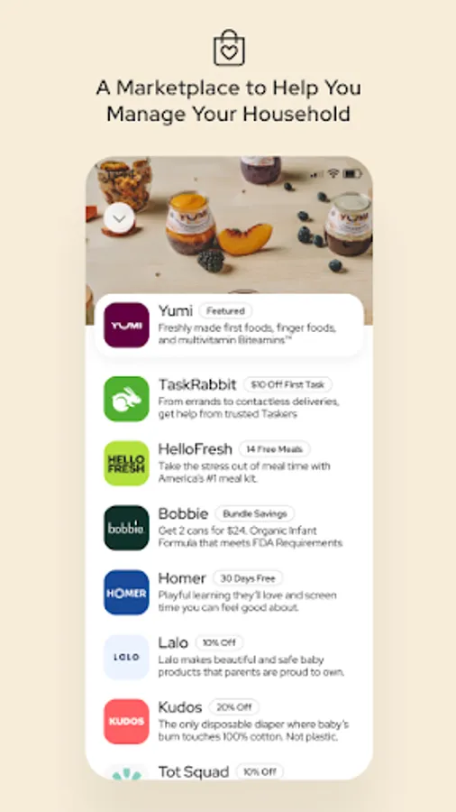 Get access to a curated set of products, deals, and services to help manage your household. Exclusive offers from 25+ helpers like TaskRabbit, HelloFresh, Bobbie, Winnie, and Yumi.