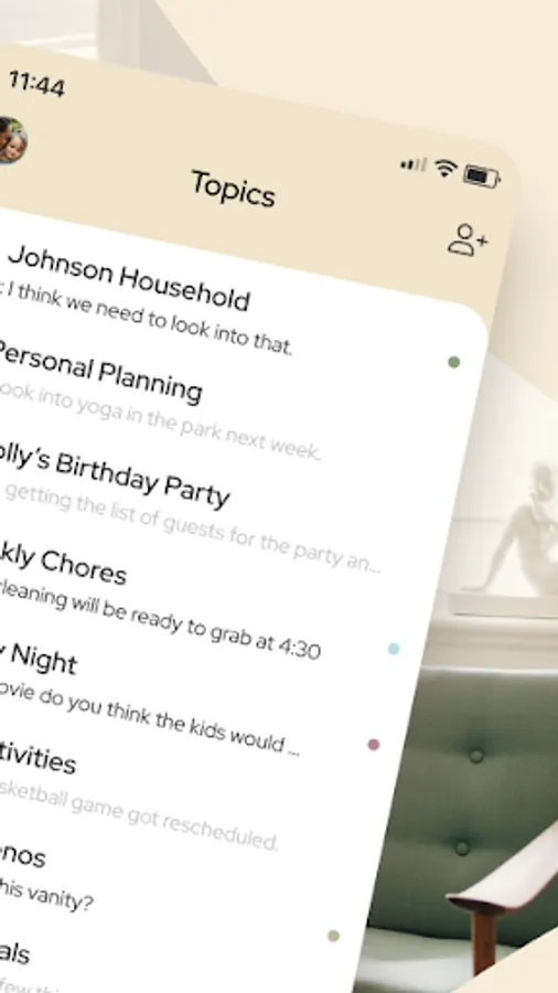 Household topics are like folders to help organize your family. Within each topic, you can chat with your family, create shared to-do lists and schedule upcoming events in the family calendar.