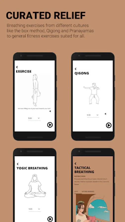Last but not least, curated activities for general well-being like international breathing practices (The West's Tactical Breathing method, Asia's Qigong and Pranayama) and general physical exercise programmes from easy, intermediate to hard.