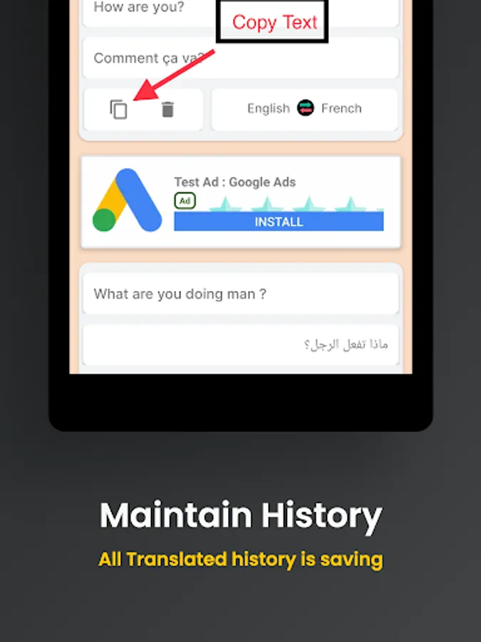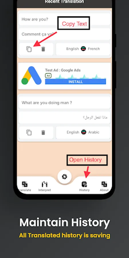 The app is maintaining the history of the all translated sentences so user can copy or share the translated text very easily with only one tap