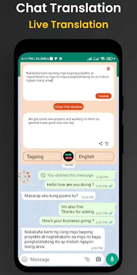 You can easily copy the translated text and use it any where or you can directly share the translated text to another app so it will work like chat translation for your social apps
