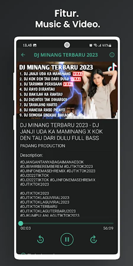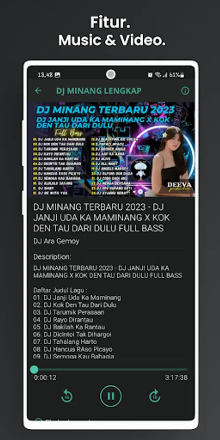 Apart from playing music, the app also supports playing music videos. You can enjoy your favorite Minang songs with attractive visuals through playing the music videos included in the application. This will provide a more immersive music listening experience with a combination of amazing audio and stunning visuals.
