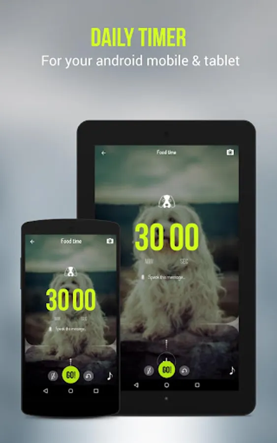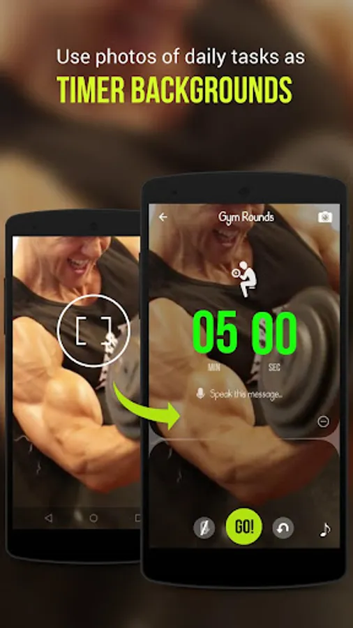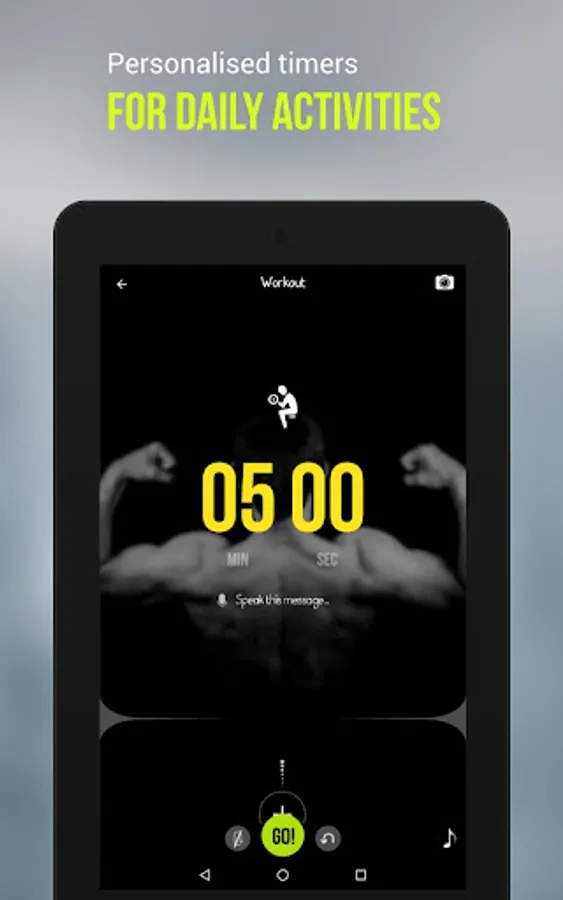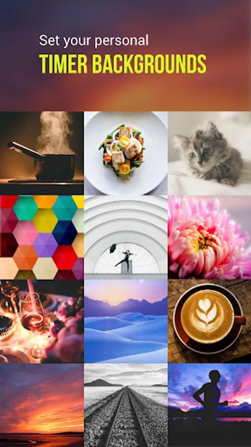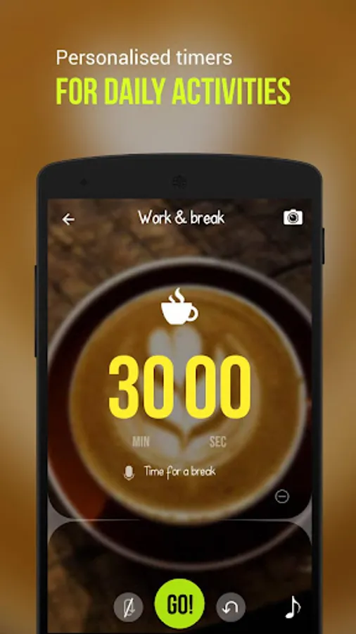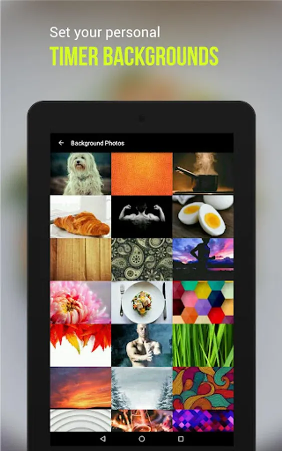 ■ Take a picture of the task : You can click a photo of the task or choose a photo representing the task from your photo Gallery. So you can take a picture of you workout/exercise, boiling egg, running, coffee break, teaching kids and then set it as a background for your timer.