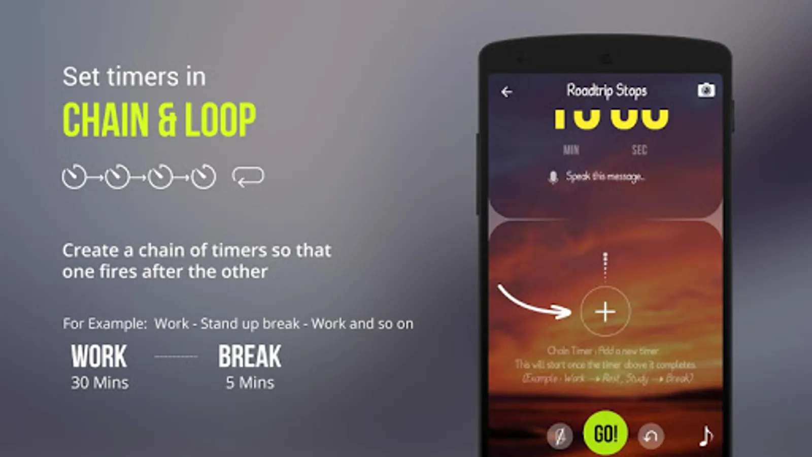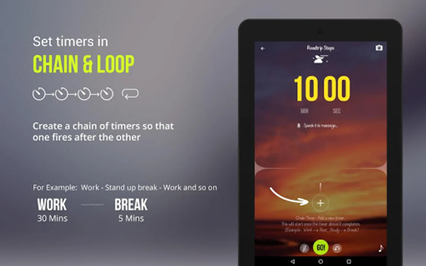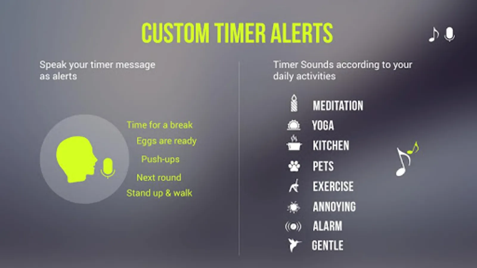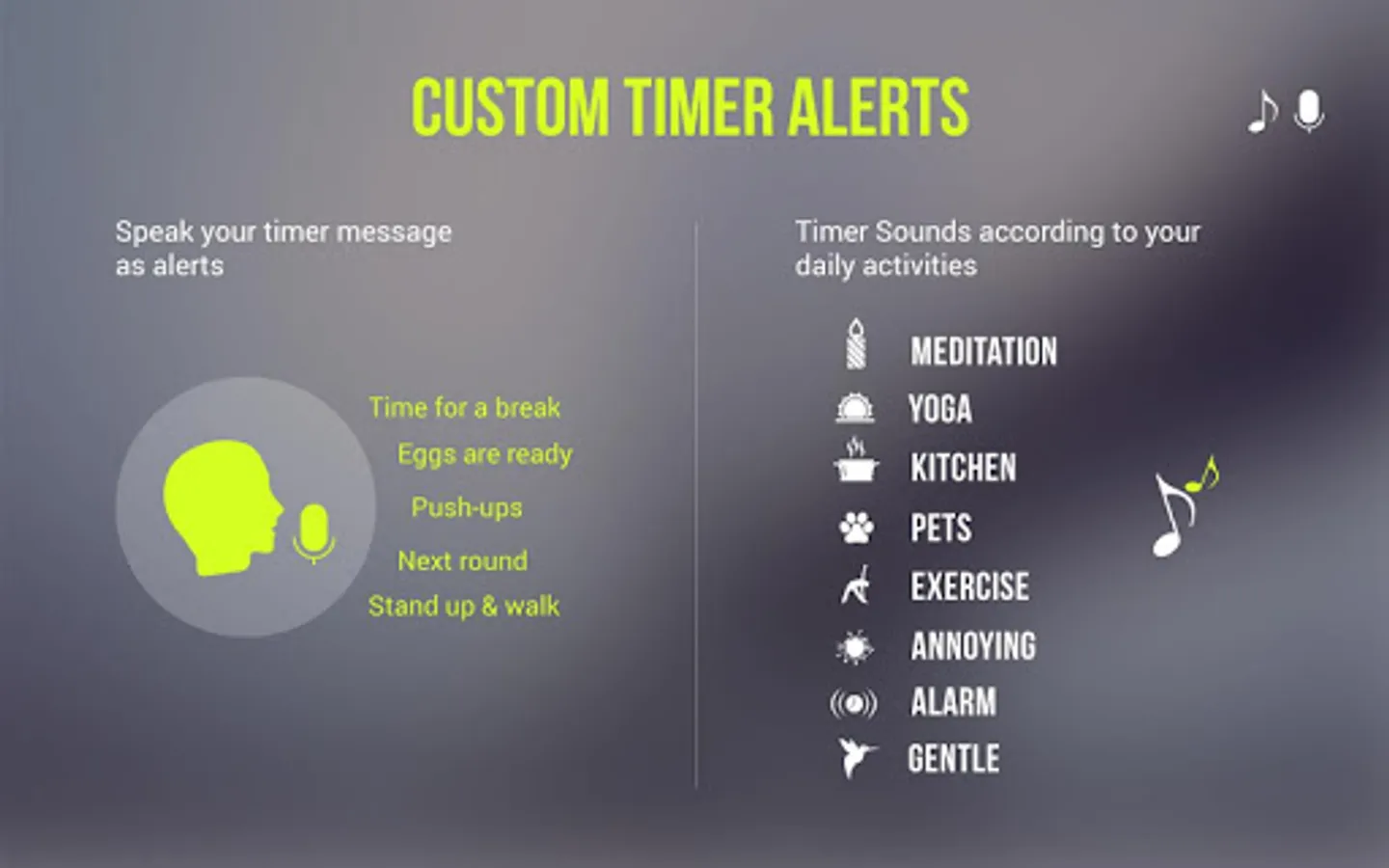 When the timer fires, you can make it speak a custom message like "Take a Break", "Feed the Dog", "Meeting in 10 minutes" and so on. Your timer then also becomes a personal reminder app for you.