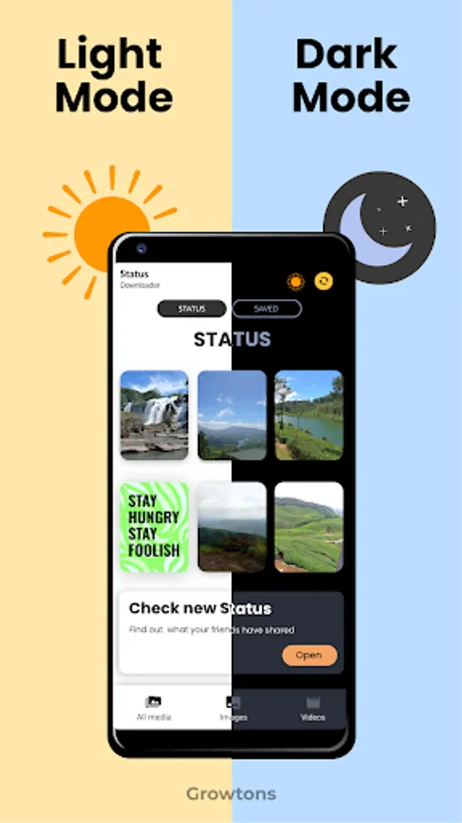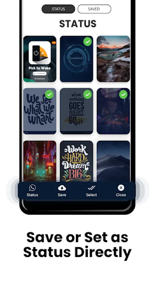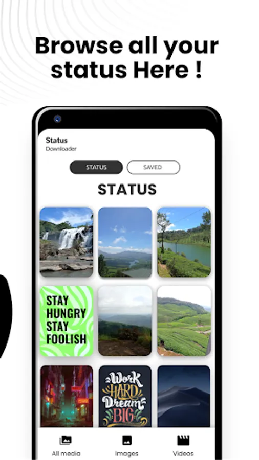 In this WA Status Downloader app, use the Status Tab and view all the current status. Switch to the Saved Tab and view all the Status Videos / Images that you have saved till now.