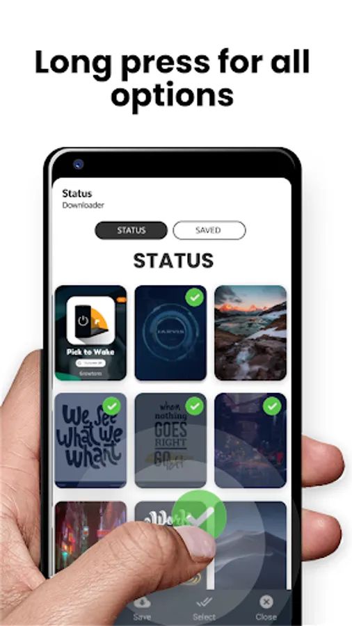 With this Status Saver, you can download status video, status images and status photos to view it later or you can directly set your friend's status video and status images as yours directly without saving. This status video downloader allows you to easily save the video status from WA messenger. Also you can save status images and status photos from WA Messenger. This Story Saver app enables you to view and share your saved status, save multiple Status at once and also you can share the saved status videos to other social media platforms.
