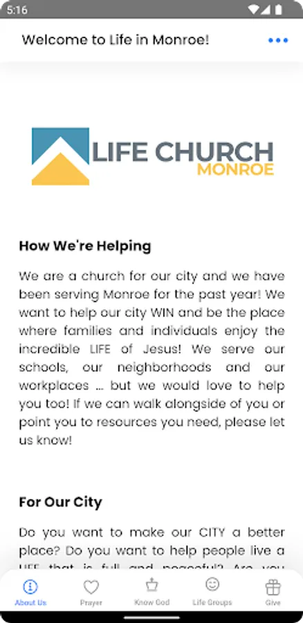 Connect with the Life Church Monroe family through our app. We are a church for our city and we have been serving Monroe for the past year! We want to help our city WIN and be the place where families and individuals enjoy the incredible LIFE of Jesus! We serve our schools, our neighborhoods, and our workplaces.