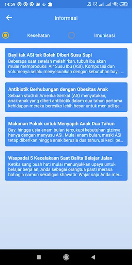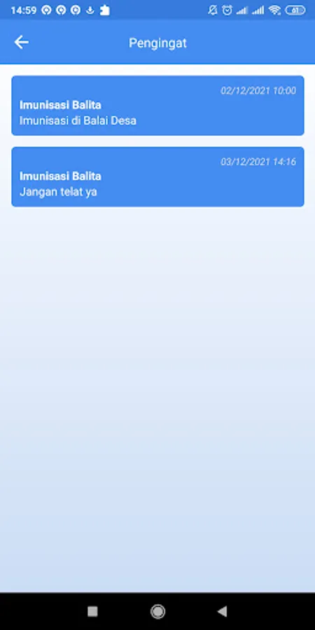 Monitoring and Reminder System for Posyandu Schedules for Toddlers Based on Mobile Application is a mobile application and website-based application that is used to accompany the Card Towards Health (KMS) book. There are two users in this application, namely posyandu cadres as website users and parents as mobile applicarion users. Posyandu cadres record and process data on the website system, which later the data will be displayed on a mobile application to be accessed by parents. In this application, parents can see their child's profile, the progress of their child's weight, height, and head circumference measurement anytime and anywhere. The data can also be viewed in graphical form, making it easier for parents to see the progress of their child's development or decline. In addition, this application can also provide pop up warnings to remind parents to immunize on the D day of the immunization implementation and the D day of the implementation. It is hoped that this will serve as a reminder for parents to do Posyandu for toddlers so that they are not late or missed in this activity. There is also an information menu that is used to provide information to parents regarding information about health and immunization or news based on the Posyandu Schedule Monitoring and Reminder System for Toddlers. There are two users in this application, namely posyandu cadres as website users and parents as mobile applicarion users. Posyandu cadres record and process data on the website system, which later the data will be displayed on a mobile application to be accessed by parents. In this application, parents can see their child's profile, the progress of their child's weight, height, and head circumference measurement anytime and anywhere. The data can also be viewed in graphical form, making it easier for parents to see the progress of their child's development or decline. In addition, this application can also provide pop up warnings to remind parents to immunize on the D day of the immunization implementation and the D day of the implementation. It is hoped that this will serve as a reminder for parents to do Posyandu for toddlers so that they are not late or missed in this activity. There is also an information menu that is used to provide information to parents regarding information about health and immunization or news on posyandu activities ita posyandu activities