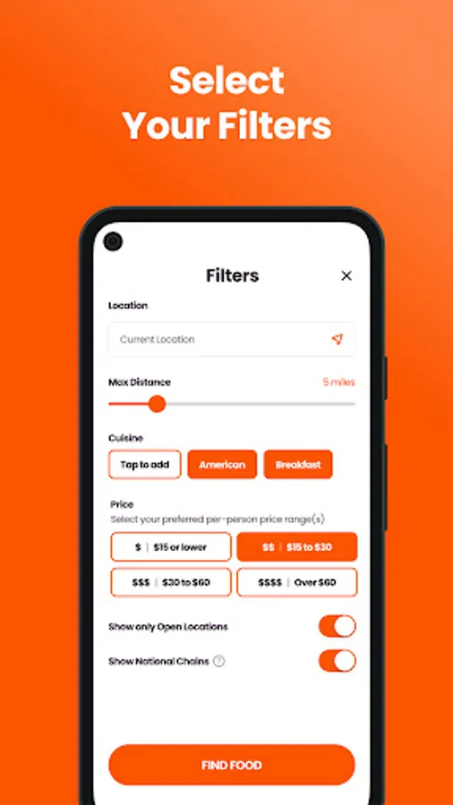 • Narrow down your choices by selecting filters based on distance, price range, cuisine type, and more!