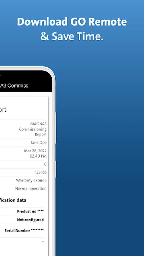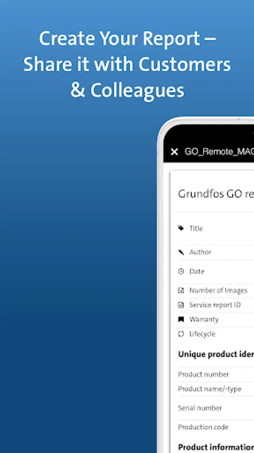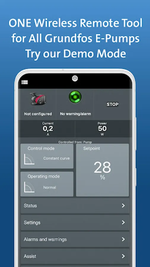 Guided setup, Application Wizards, Alarms and Warnings log with trouble shooting, Automatic Documentation of settings via pdf report and direct access to pump information in Grundfos Product Center is available in the palm of your hand.