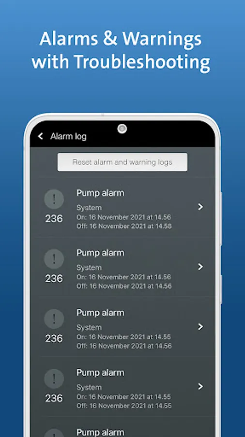 • Alarms and warnings - detailed information of events with time stamps and trouble shooting guidance