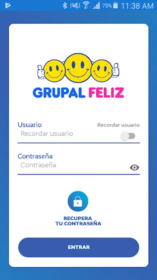 The Happy Group App has a screen for controlled entry through a user and a password that can be recovered in case the user forgets it or typs incorrectly causing the user to block it; The App sends an email with a temporary password to allow access requesting its change once the user accesses it.