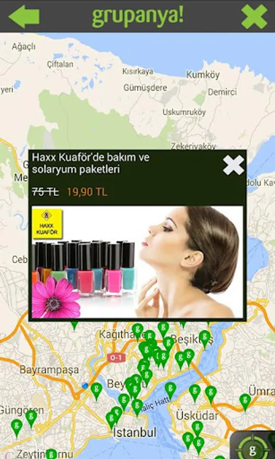 Click the location icon in the lower right corner. Map your location and will show you the surrounding opportunities. Grupanya you can see by clicking on the map pins deals content. Do not forget to give permission to access your location information to seize opportunities nearest you!