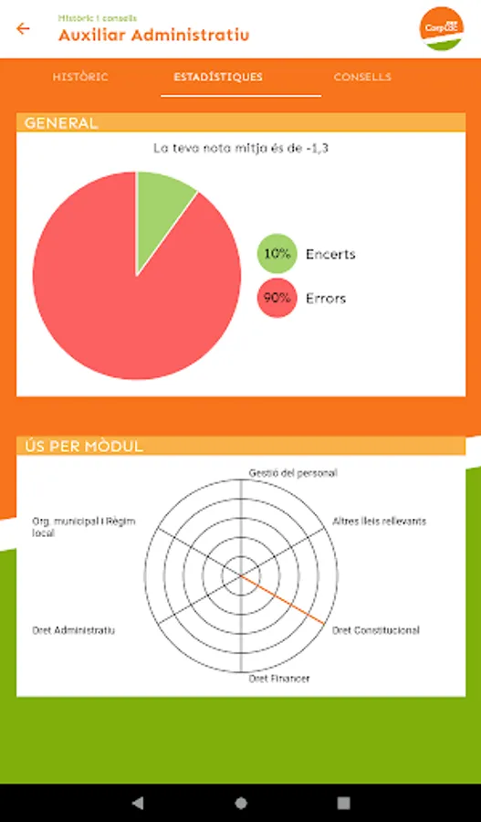 The goal we seek with this application is to put tools at your disposal that facilitate your study task and the assimilation of content. For this reason we have designed a very visual environment, which facilitates retention. In addition, in the "History and advice" section you can see your history (tests taken, grades you have obtained, questions you have failed), detect your areas of improvement and, following the instructions we give you in "Tips" section, be aware of how you should work.