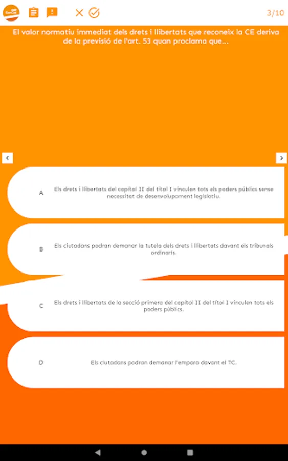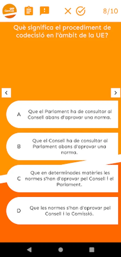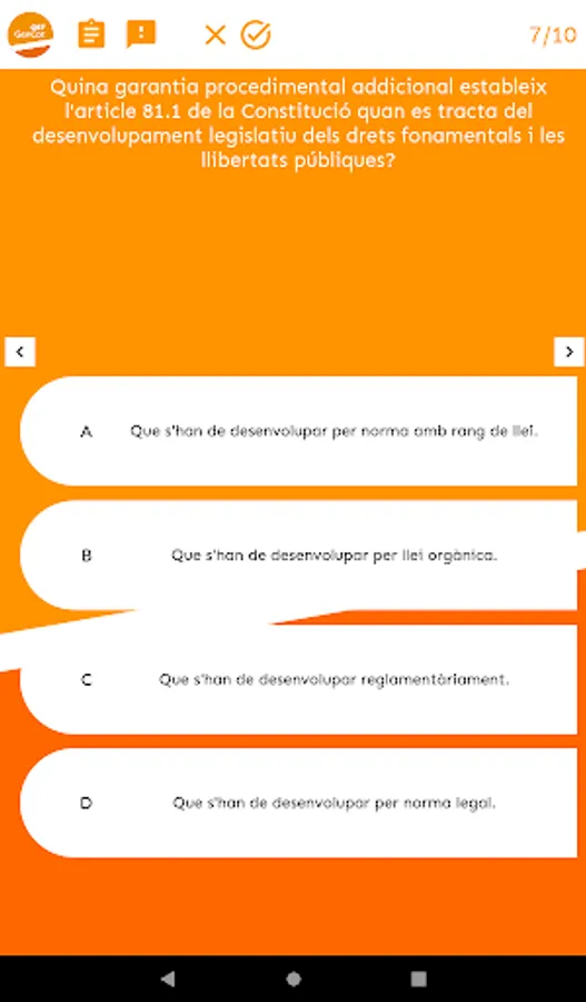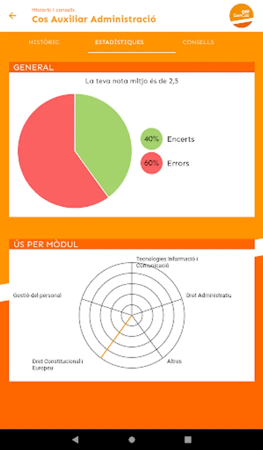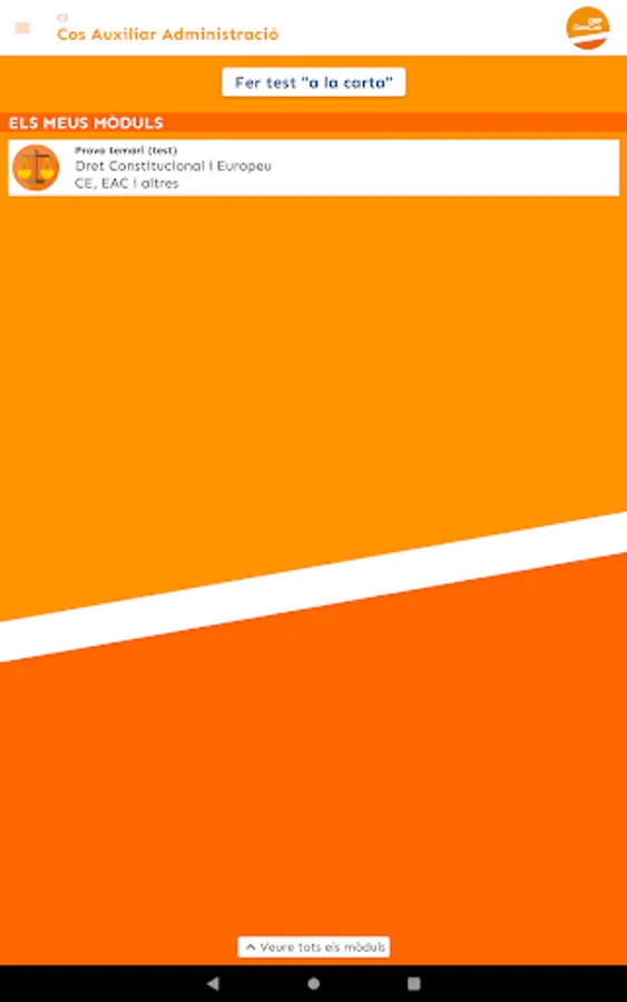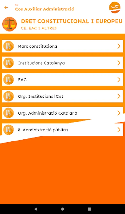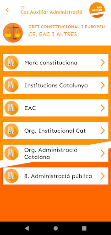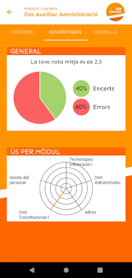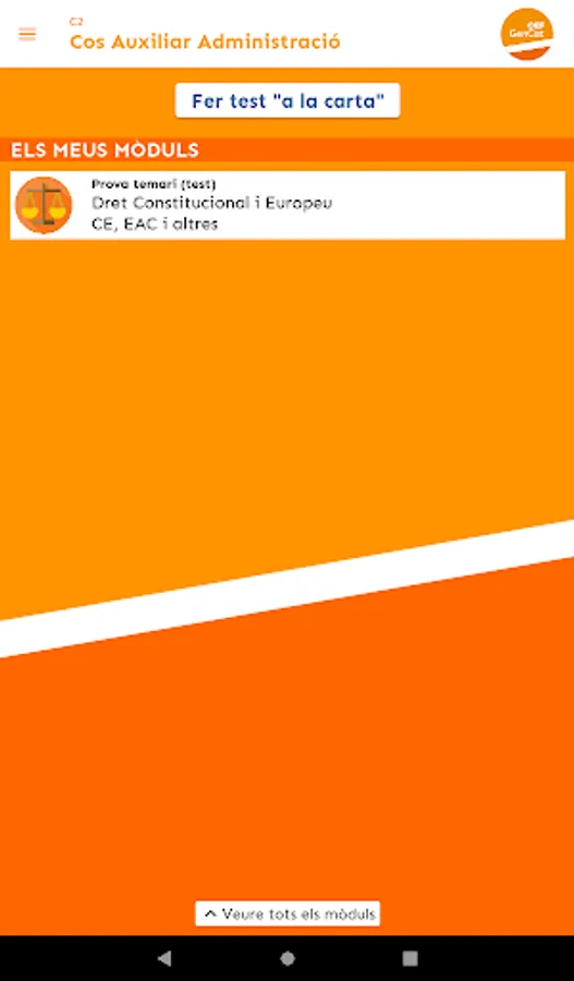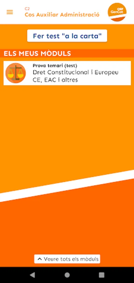 At OEF Gencat you will find useful, up-to-date and quality teaching materials that will help you in your preparation for the Generalitat de Catalunya exams (Generalitat Subaltern body, Generalitat Administrative Assistant body, Generalitat Administrative Body...). Specifically, we provide you with tests to test yourself, mock exams, exam models from recent years, and personalized study tips based on your test-taking performance.