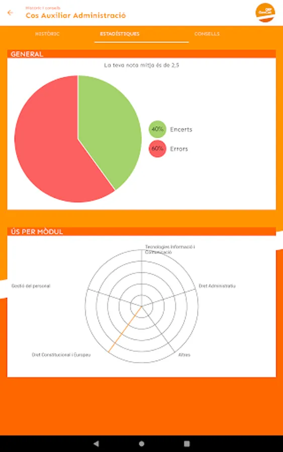 The goal we seek with this application is to put tools at your disposal that facilitate your study task and the assimilation of content. For this reason we have designed a very visual environment, which facilitates retention. In addition, in the "History and advice" section you can see your history (tests taken, grades you have obtained, questions you have failed), detect your areas of improvement and, following the instructions we give you in "Tips" section, be aware of how you should work.
